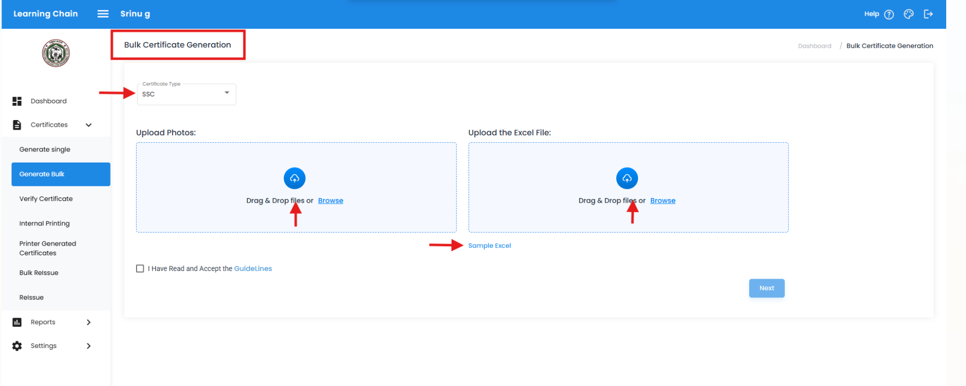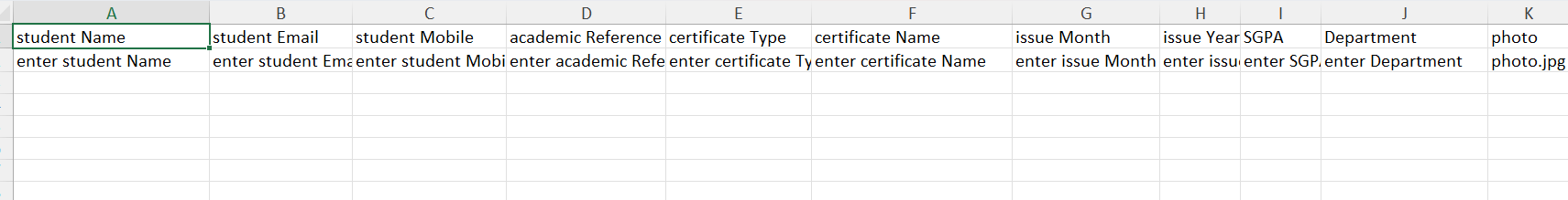 Note: We can also secure 'N' number of certificates into the Blockchain by using Generate Bulk Module. Here we need to upload respective images in JPG format and also respective meta data needs to be uploaded in Excel format as shown below.