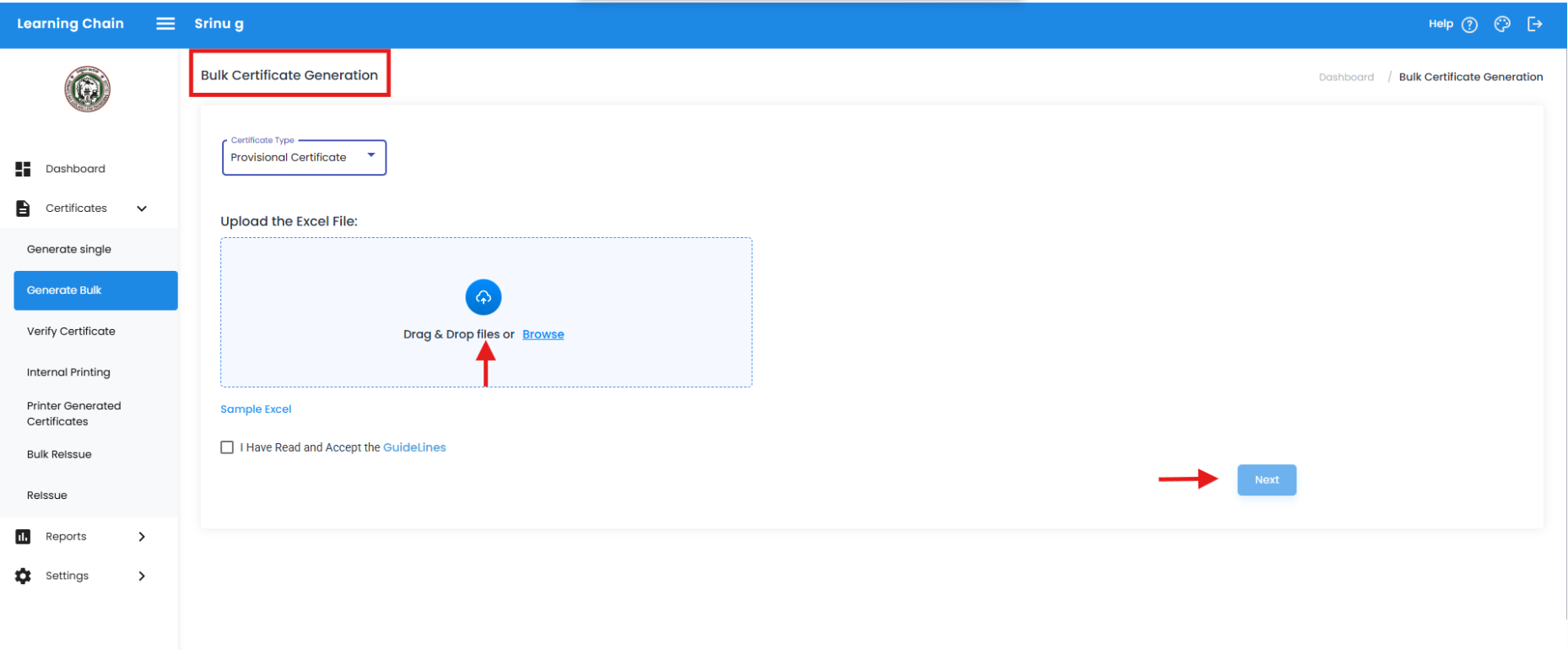 Note: We can also secure 'N' number of certificates into the Blockchain by using Generate Bulk Module. Here we need to upload respective meta data in Excel format as shown below.