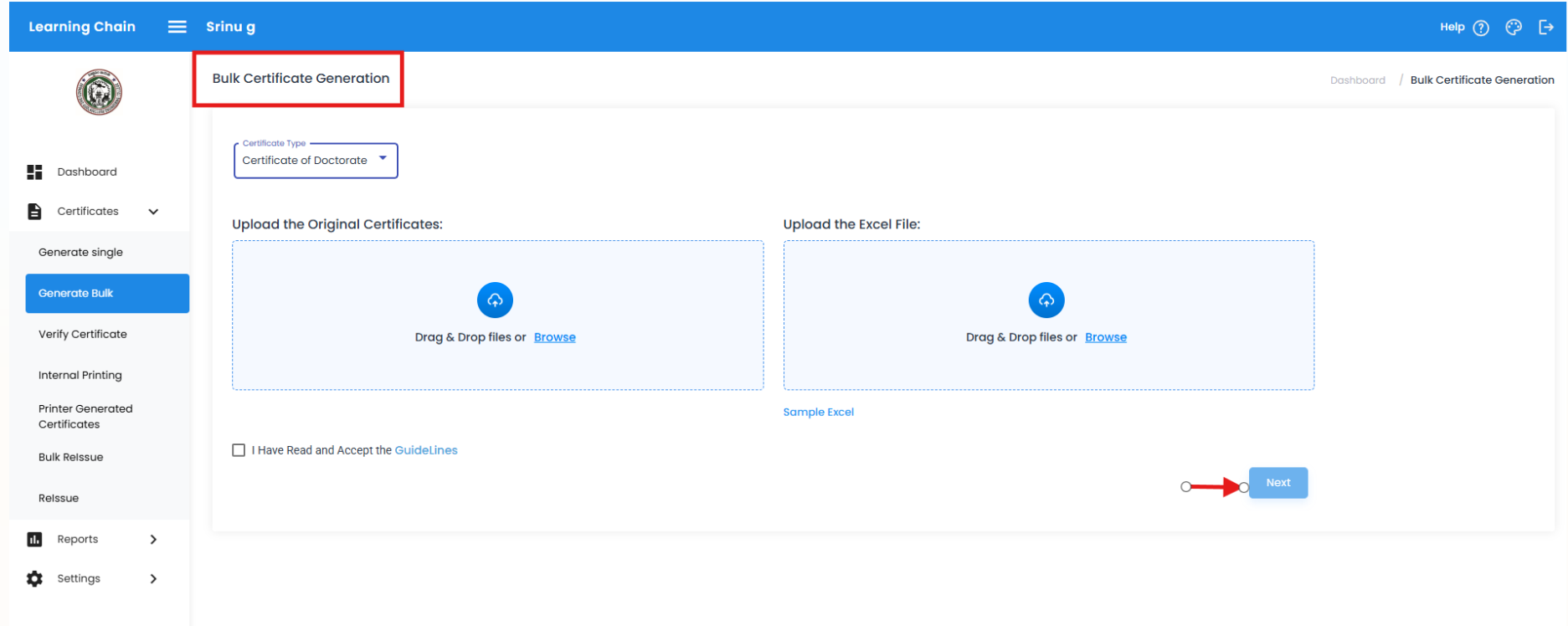 Note: We can also secure 'N' number of certificates into the Blockchain by using Generate Bulk Module. Here we need to upload the pdf file and also the respective meta data in Excel format as shown below.